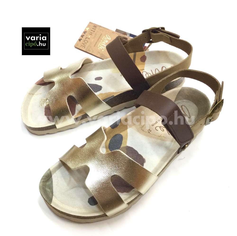 Arany, barna és bézs színű, Anekke szandál anatómiai kialakítású, parafa talpon. Talpa egyedi nyomatokkal díszített. Felső része csattal és tépőzárral a megfelelő méretűre állítható.