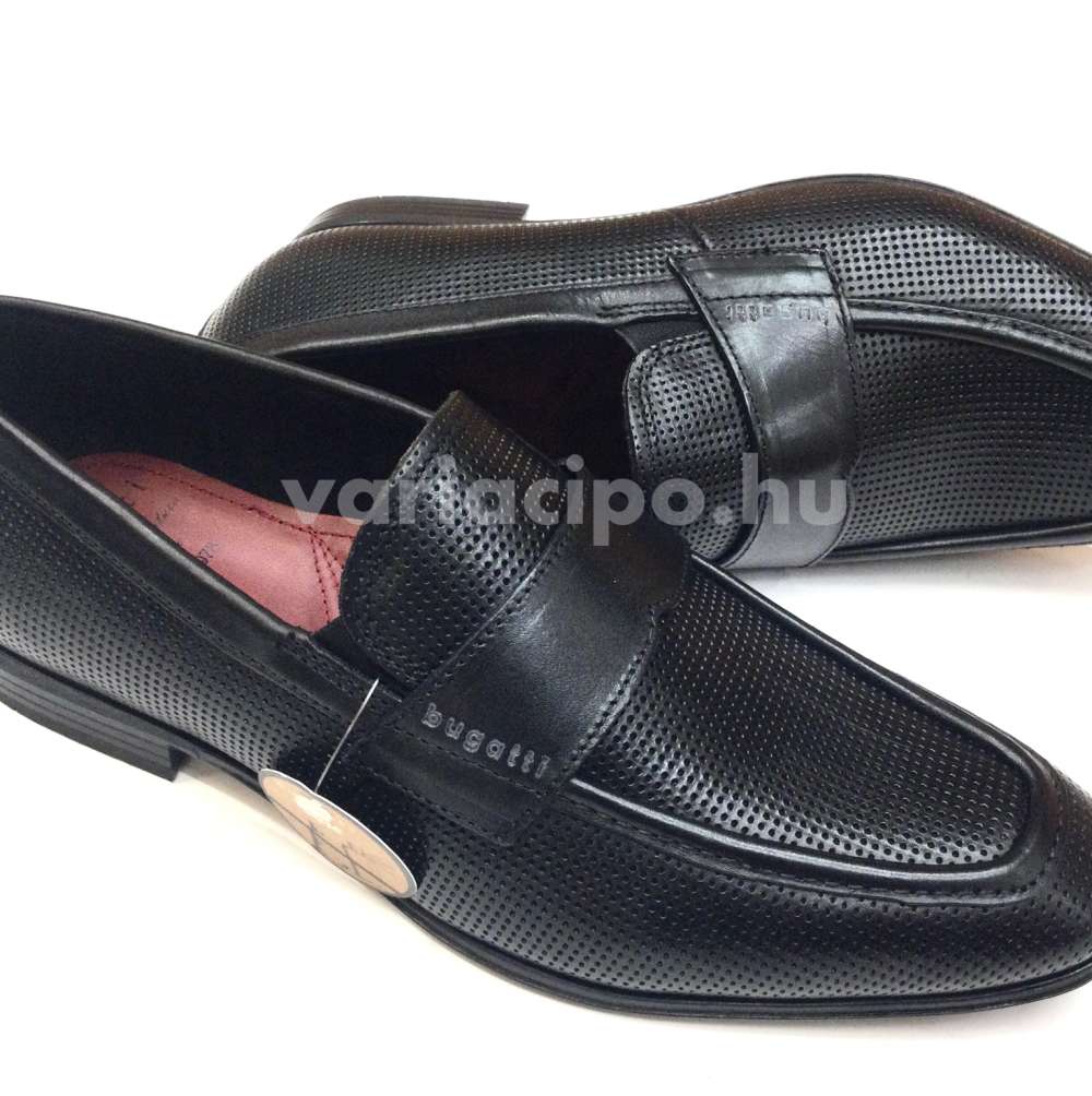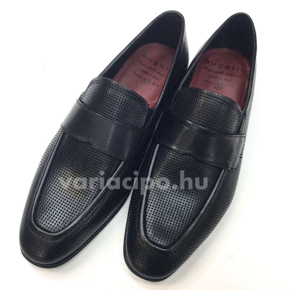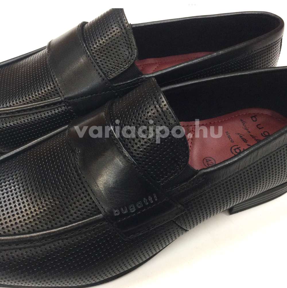 Bugatti belebújós fekete alkalmi cipő. Slip-on típusú modell elegáns, perforált bőr felsőrésszel.