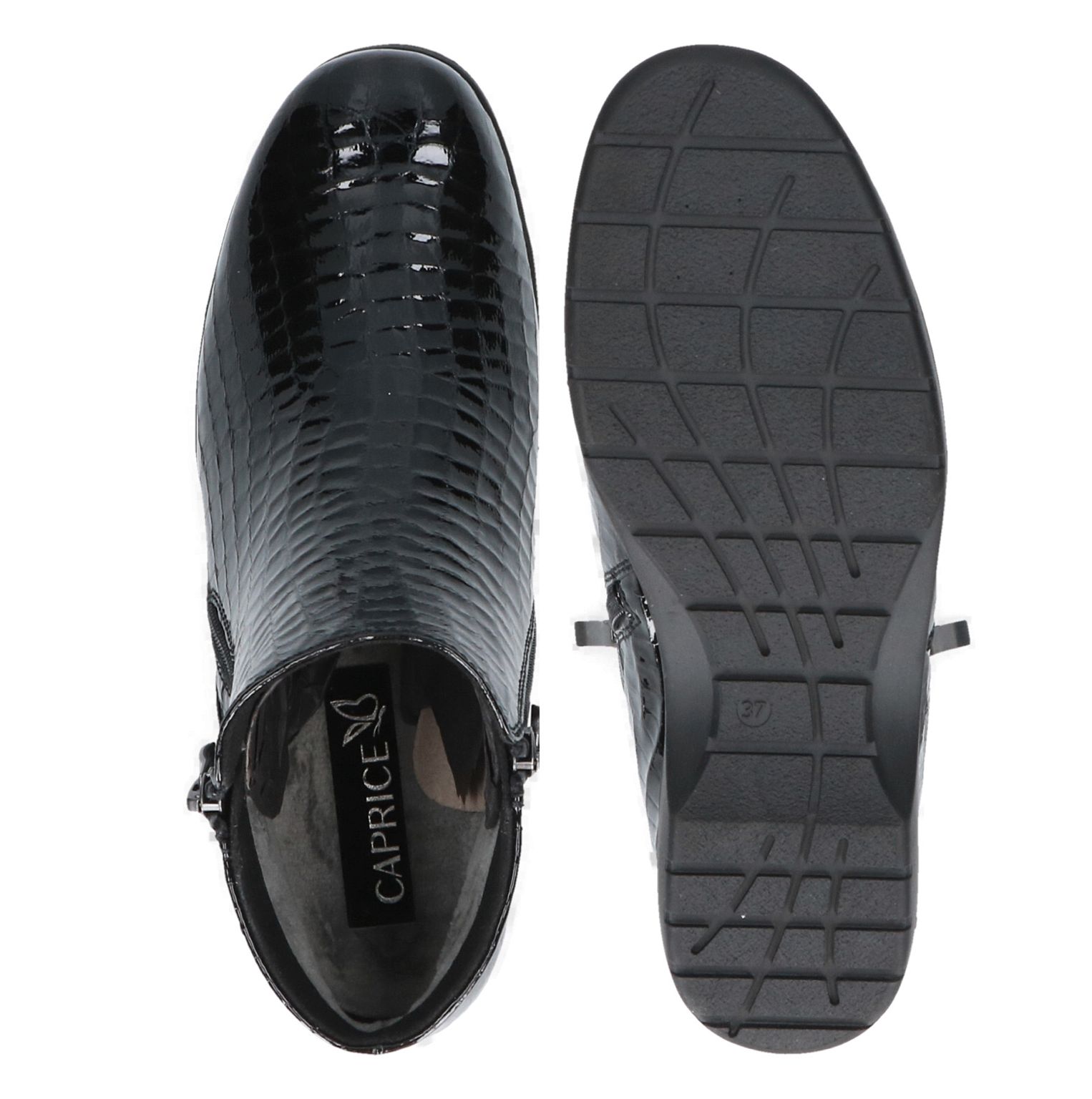 Caprice fekete lakk bokacipő valódi bőr felsőrésszel. Klasszikus kényelmi modell H- szélességgel. A cipő könnyű felhúzását dupla cipzár biztosítja. Klasszikus forma, minőségi anyagok felhasználása és elegáns megjelenés jellemzi ezt a Caprice modellt. Vékony béléssel készült.