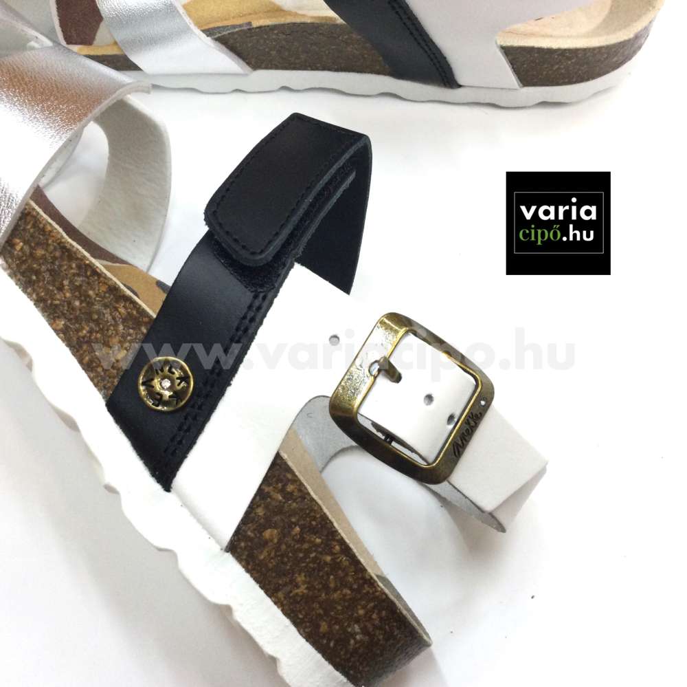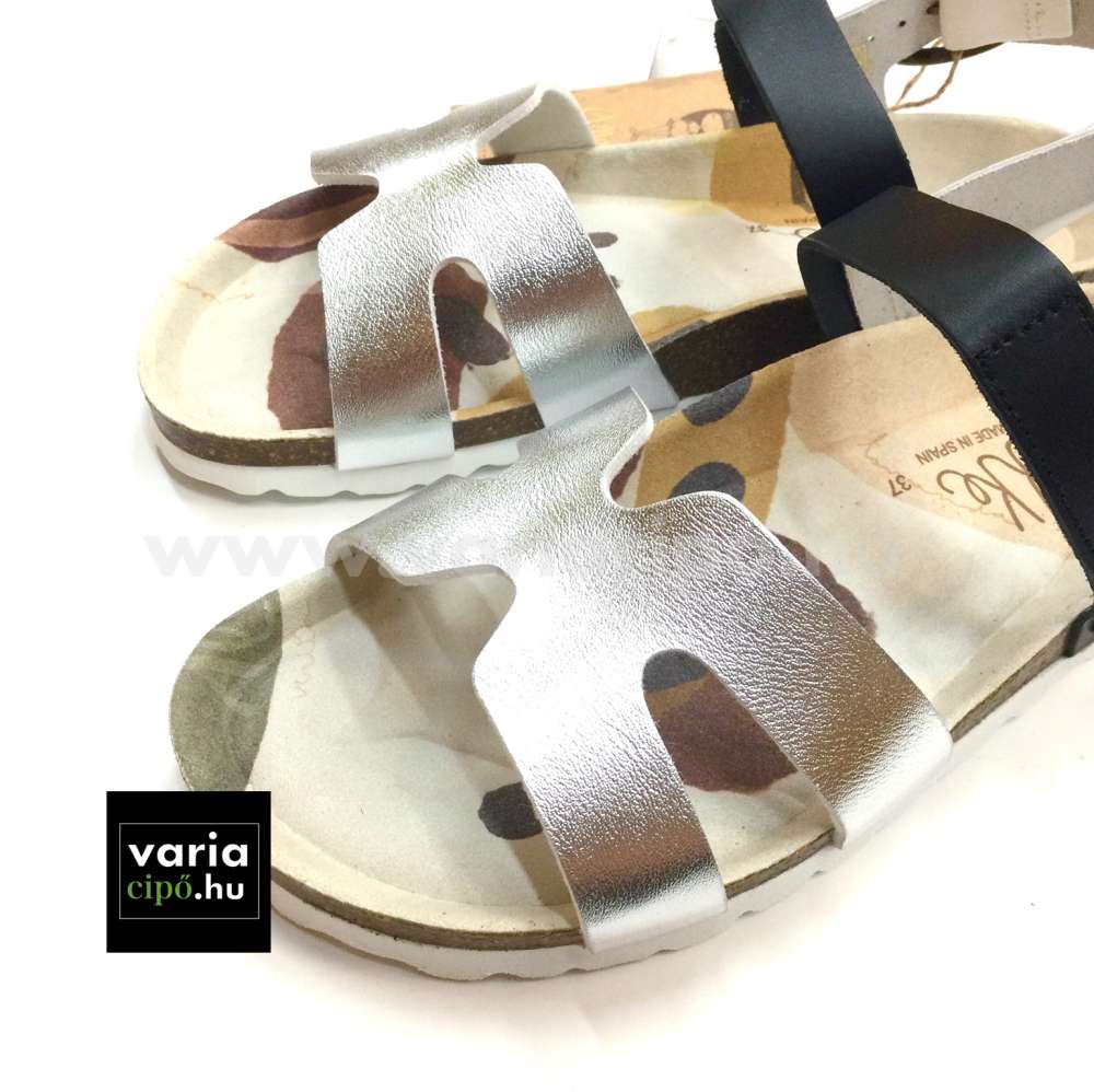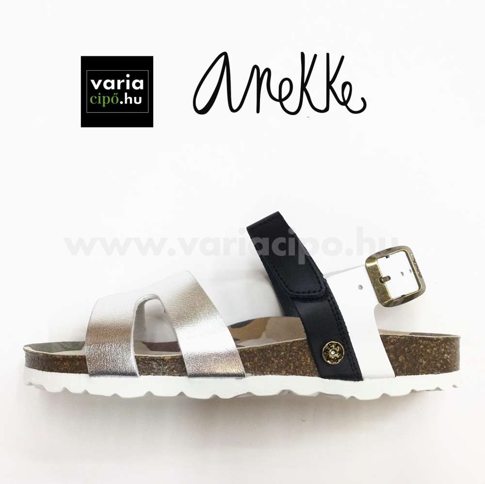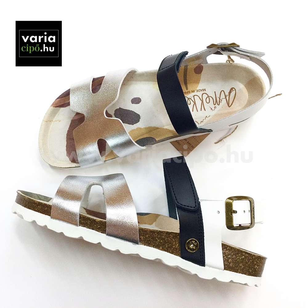 Ezüst, fehér és fekete színű, Anekke szandál anatómiai kialakítású, parafa talpon. Talpa egyedi nyomatokkal díszített. Felső része csattal és tépőzárral a megfelelő méretűre állítható.