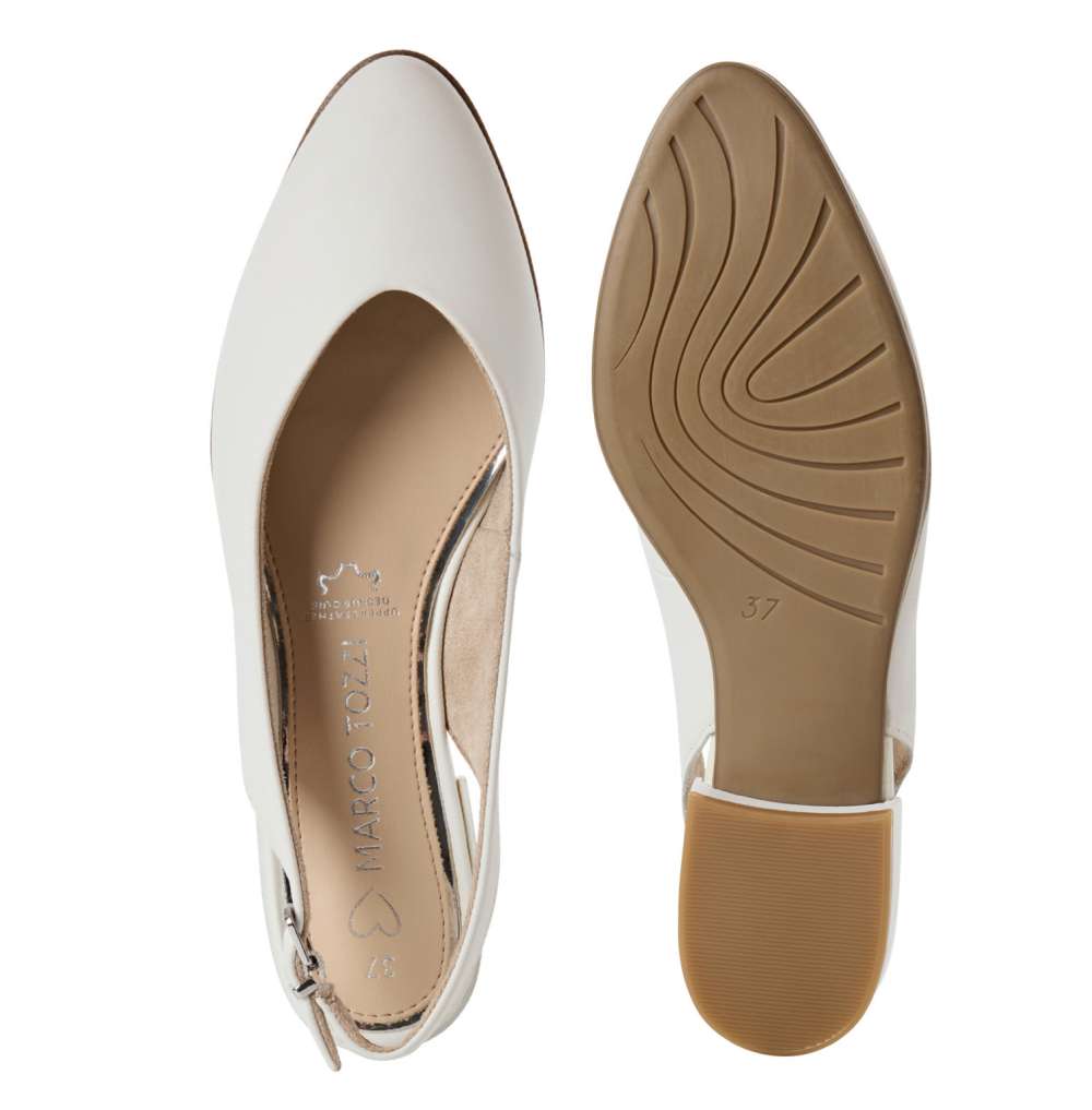 Kellemes anyagú női sling valódi bőr felsőrésszel, fehér színben. Lapos sarkú Marco Tozzi tavaszi-nyári cipő. Felső része puha, valódi bőr. Kényelmét “FEEL ME” memóriahabos talpbetét fokozza. Talpa barna, 3,5 cm-es sarokkal.