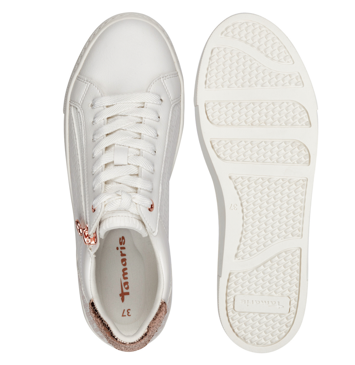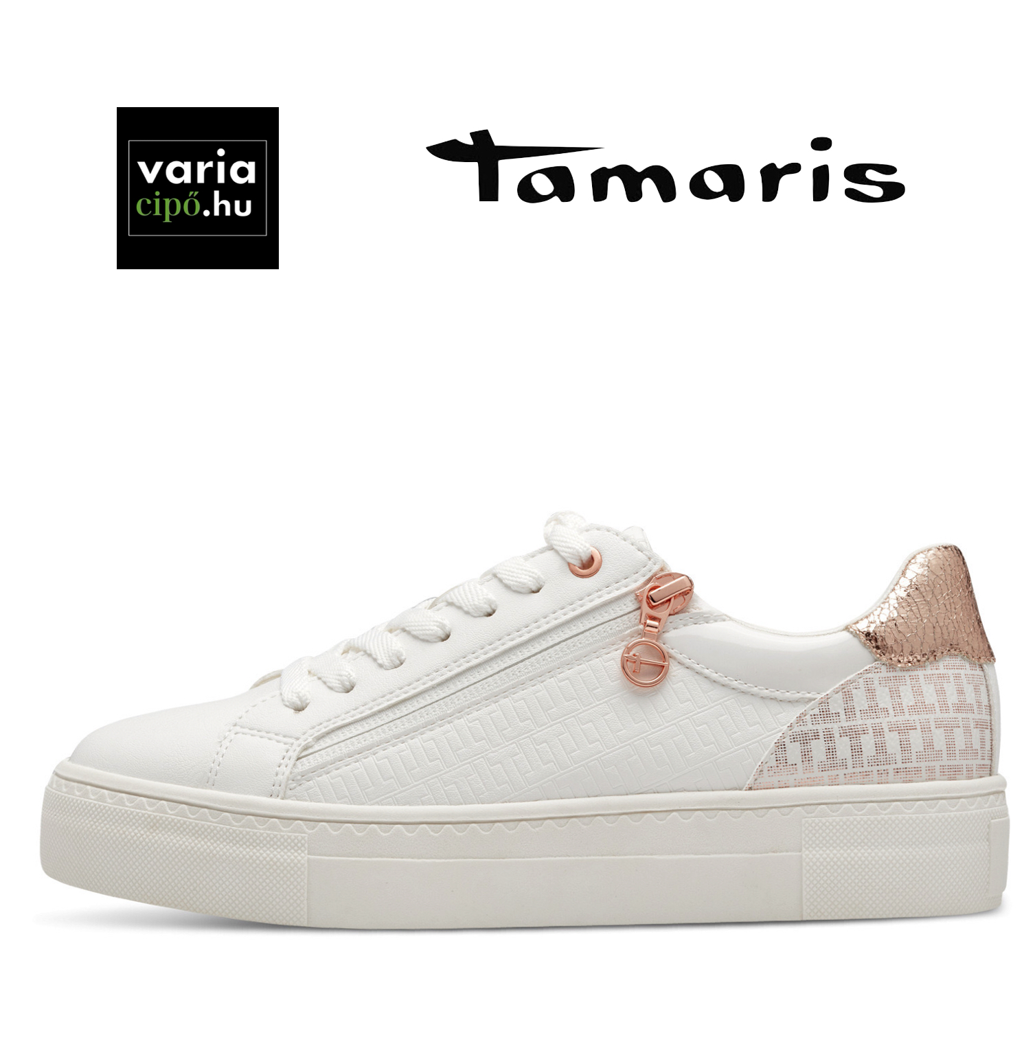 Fehér Tamaris sportcipő. Klasszikus Tamaris utcai sportcipő, kissé vastagabb talpon, elegáns, fehér-rosegold színben. A modell kivehető, cserélhető talpbetéttel rendelkezik.