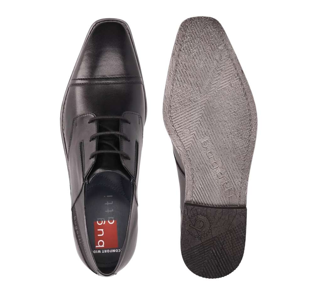 Fekete Bugatti alkalmi cipő – klasszikus formatervezésű, elegáns félcipő alkalmi vagy üzleti viselethez, fekete színben, talprészén szürke árnyalattal. Felső része minőségi bőrből, orrvarrással készült. Komfort szélességű modell.