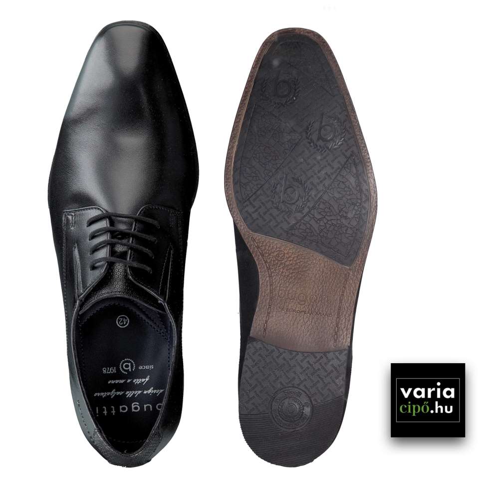Fekete Bugatti  alkalmi félcipő, letisztult formavilágú elegáns felsőrésszel, fekete színben. Tökéletes üzleti és alkalmi viselet. Felső részén dupla gumis betét segíti a lábhoz való illeszkedést , e betétnek köszönhetően  magasabb lábfejhez ajánlott modell.