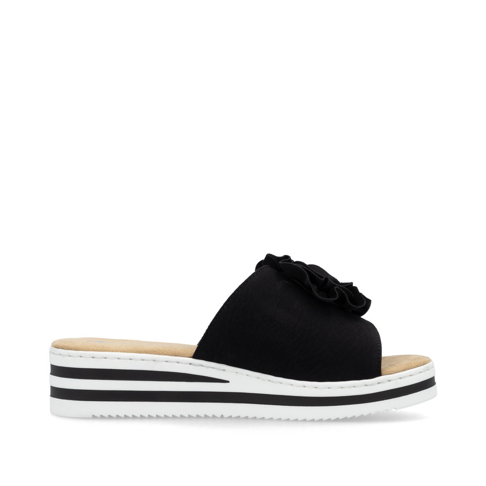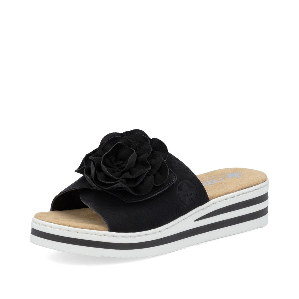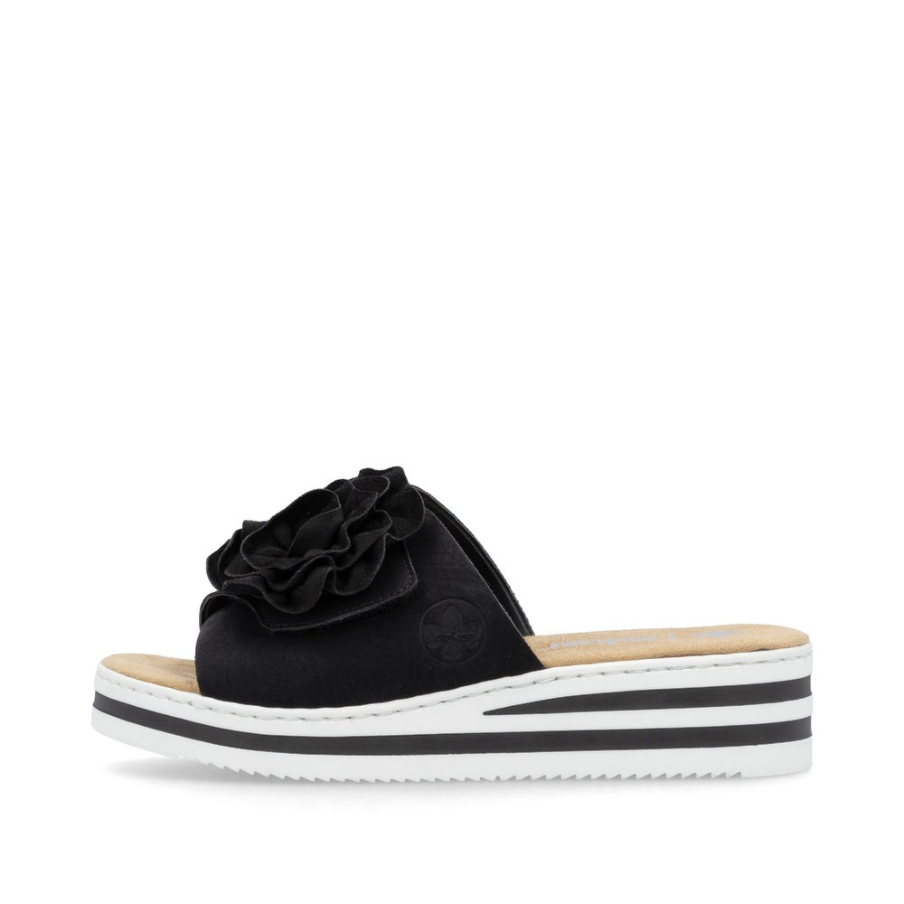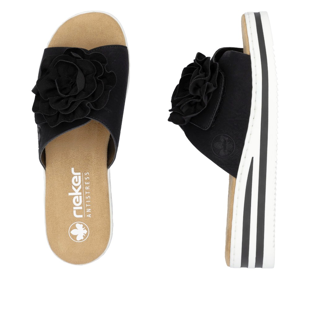 Emelt talpú Rieker papucs fekete színben , virágdíszítéssel. A papucs tépőzáras, állítható pánttal készült. Belsejében puha textil talpbetétet találunk. Talpa rugalmas, fekete és fehér szín kombinációja, mely egyedi formájával modern megjelenést kölcsönöz a modellnek. Bármely korosztálynak, egész napos viseletre is ajánljuk. A cipő ANTISTRESS® technológiával készült- ennek köszönhetően a talp könnyű, rugalmas, elnyeli az ütéseket lépéskor, és könnyen alkalmazkodik minden lábtípushoz.