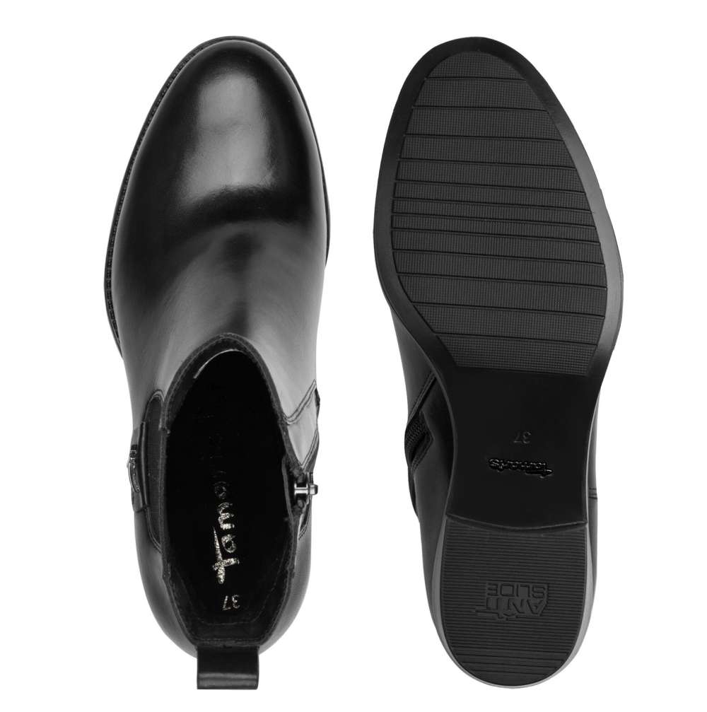 Fekete Tamaris Chelsea csizma – Klasszikus vonalvezetésű, Chelsea-típusú csizma, Közepes magasságú, valódi bőr felsőrésszel és közepes magasságú sarokkal. Letisztult formavilágával, időtálló anyagával tökéletes alapdarab a sportos-elegáns stílushoz. Mérsékelten vízálló modell. Talp: TAMARIS ANTISLIDE: A szabadalommal ellátott technológia minden felületen tökéletes tapadást biztosít a cipőtalp számára.