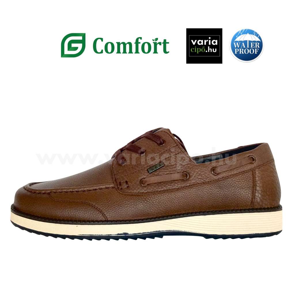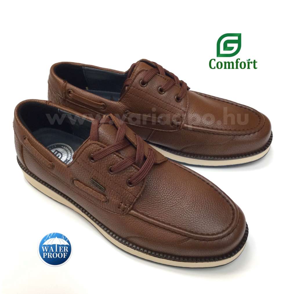 G-Comfort férfi vitorláscipő. Kiváló minőségű bőrből készült férfi félcipő. Barna felsőrésze világos talppal kombinált. A cipő felhúzását és a lábhoz való illeszkedését fűző biztosítja. H-szélesség, kivehető talpbetét, puha párnázottság és csúszásmentes talp fokozza a modell kényelmét.