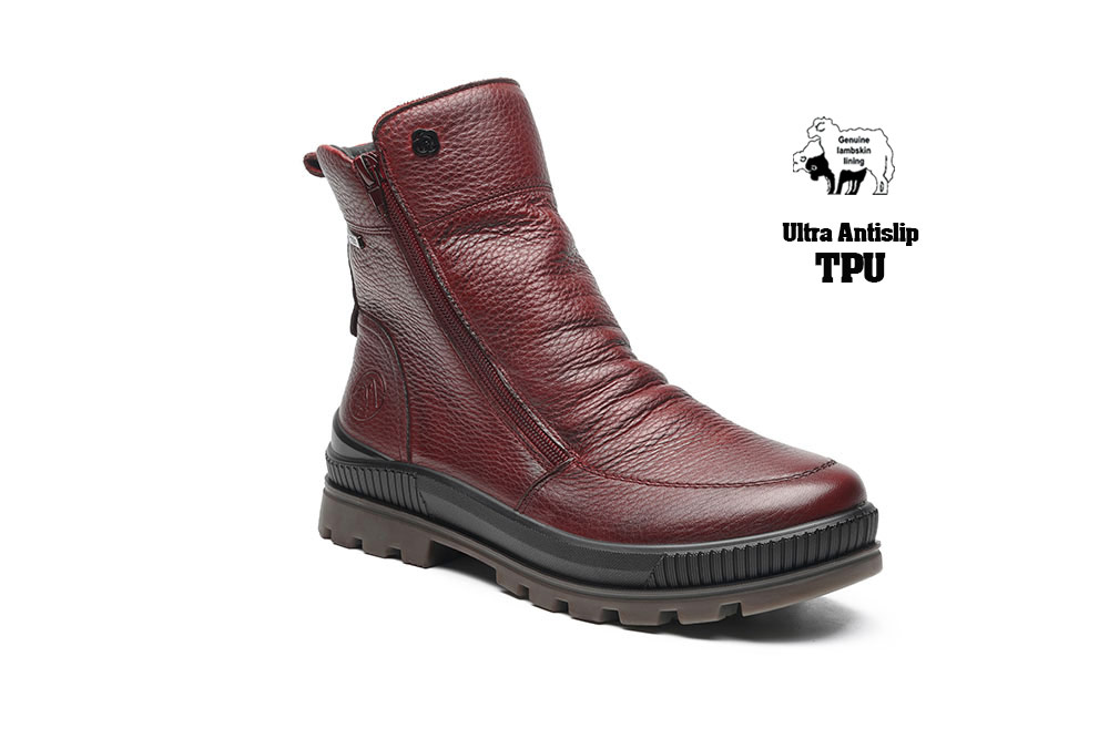 G-Comfort vízálló bokacsizma bordó színben. Kiváló minőségű himalájai jakbőrből készült magas szárú cipő meleg béléssel. Komfort, H-szélesség és kivehető talpbetét és csúszásmentes talp fokozza a modell kényelmét. A lábhoz való illeszkedést és a cipő felhúzását mindkét oldalán cipzár segíti. Vízálló cipő!