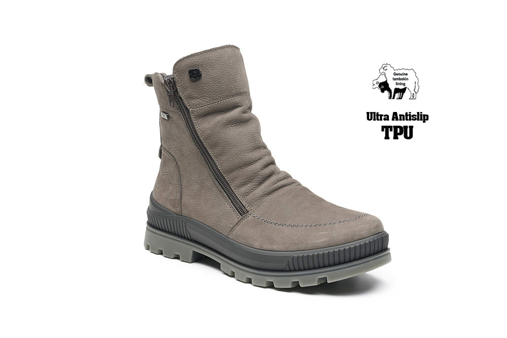 G-Comfort vízálló bokacsizma szürke színben. Kiváló minőségű himalájai jakbőrből készült magas szárú cipő meleg béléssel. Komfort, H-szélesség és kivehető talpbetét és csúszásmentes talp fokozza a modell kényelmét. A lábhoz való illeszkedést és a cipő felhúzását mindkét oldalán cipzár segíti. Vízálló cipő!