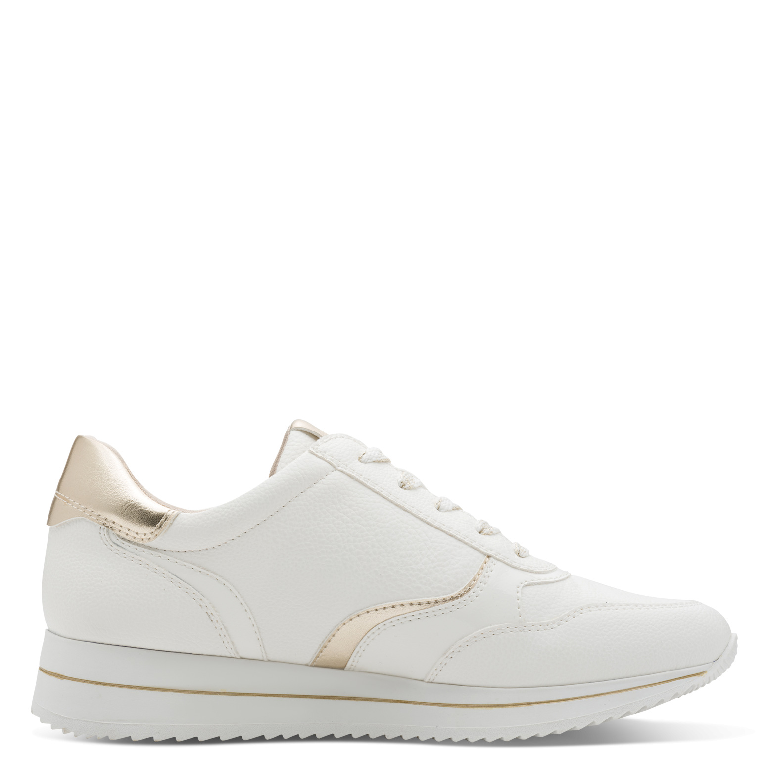 Jana fehér sportcipő arany és fehér színkombinációval. Sportos, kényelmes utcai sneaker, lapos sarokkal. A cipő felhúzását és lábhoz való illeszkedését fűző és cipzár is segíti. A modell “H”-kényelmi szélességgel és újrahasznosított anyagok felhasználásával készült. Jana Softline kollekció. Vegán cipő!