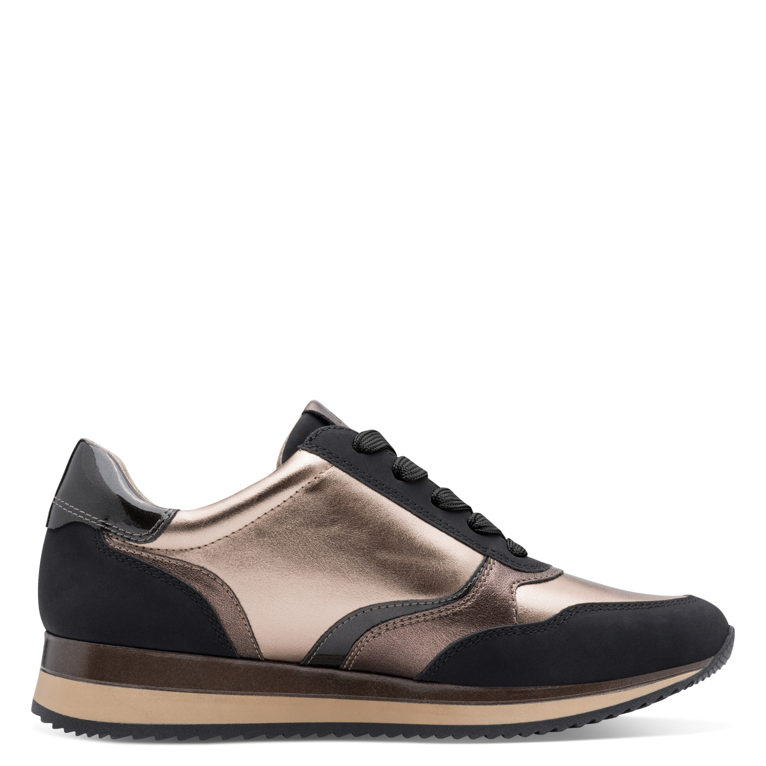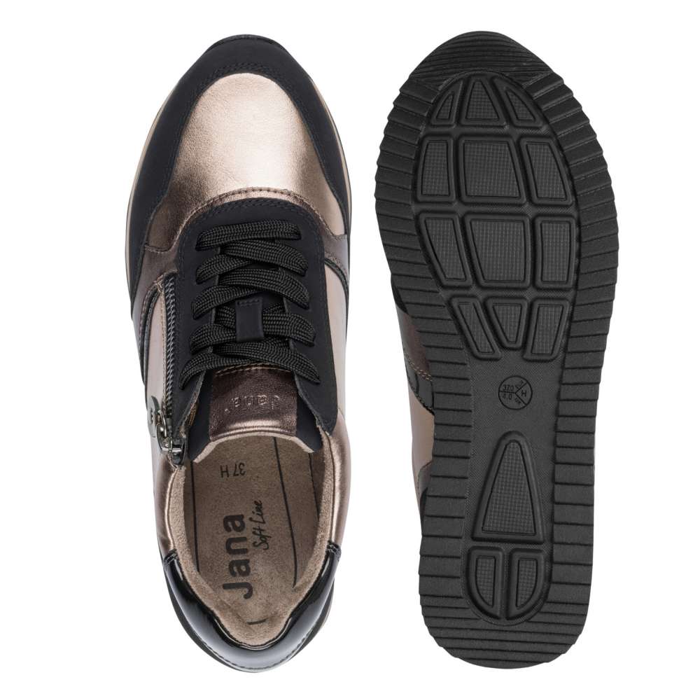 Jana fekete-metál sportcipő ón és fekete színkombinációval. Sportos, kényelmes utcai sneaker, lapos sarokkal. A cipő felhúzását és lábhoz való illeszkedését fűző és cipzár is segíti. A modell “H”-kényelmi szélességgel és újrahasznosított anyagok felhasználásával készült. Jana Softline kollekció.
