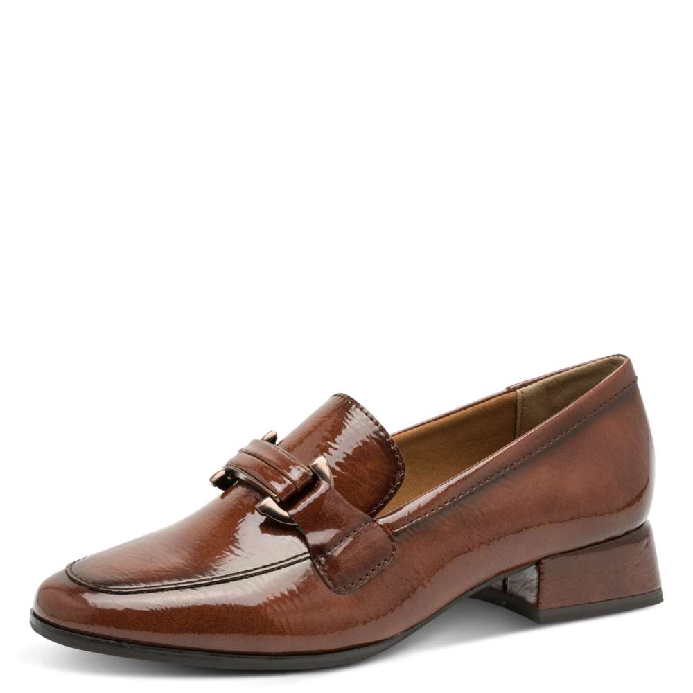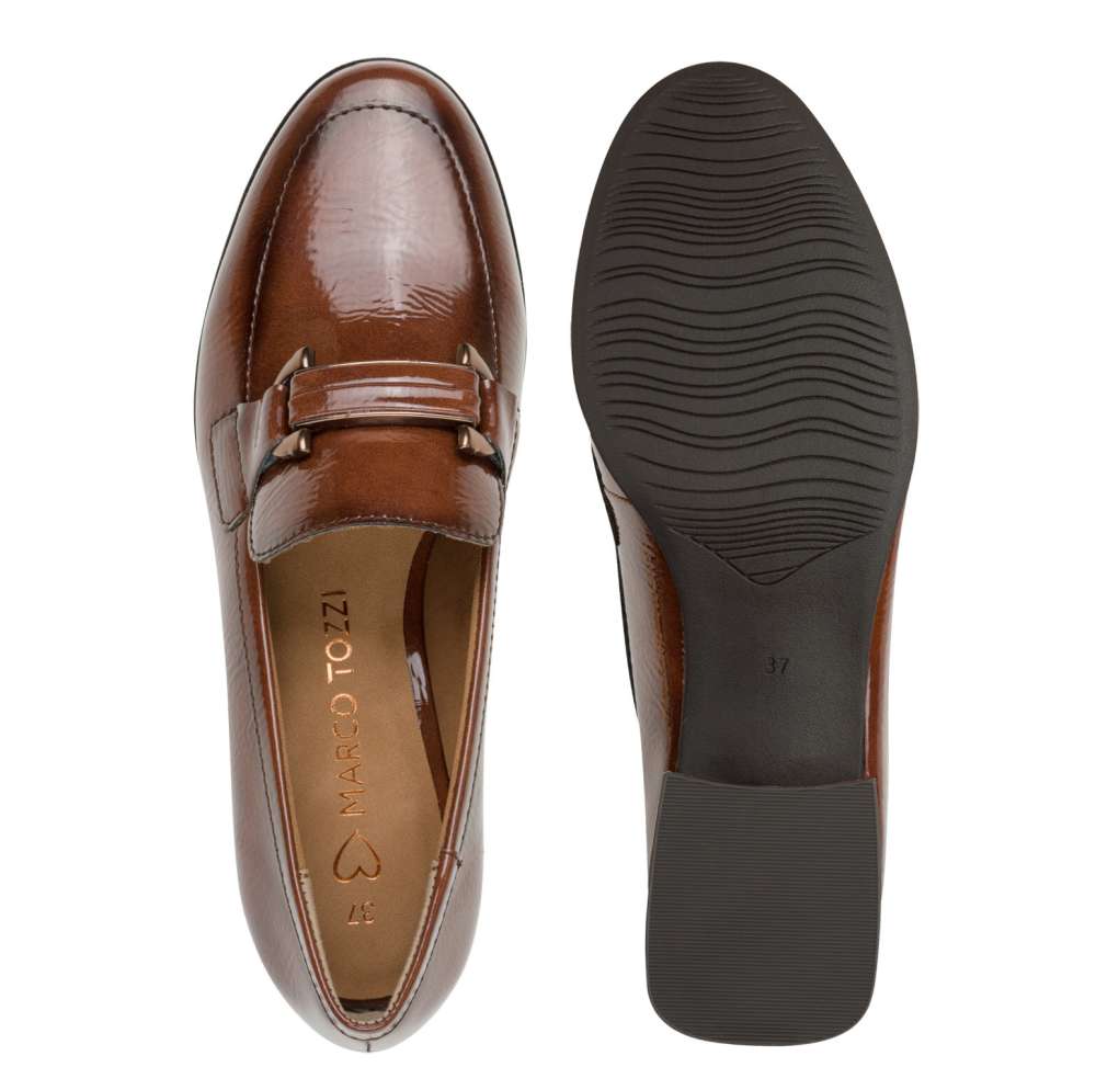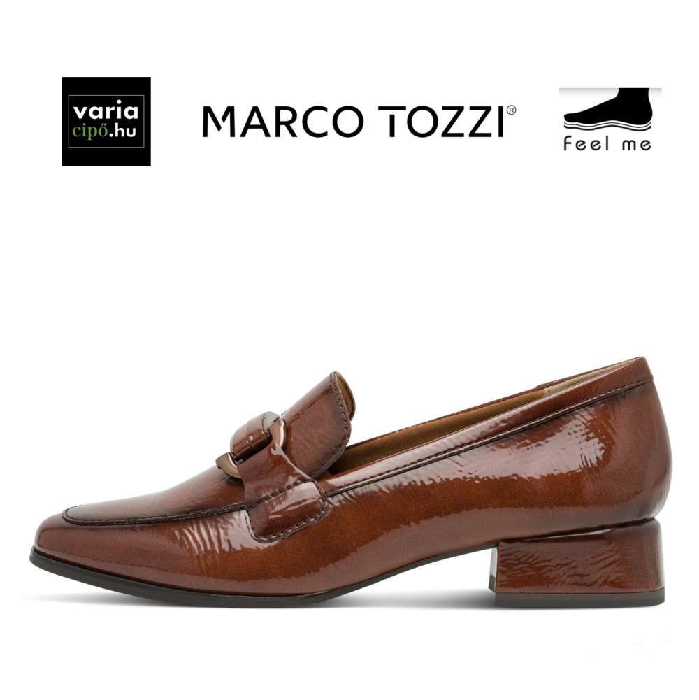 Alacsony, block-sarkú női félcipő lakk-barna felsőrésszel a MARCO TOZZI új kollekciójából! Kényelmét “FEEL ME” memóriahabos talpbetét és “ANTI SHOKK” gerinckímélő sarok fokozza.