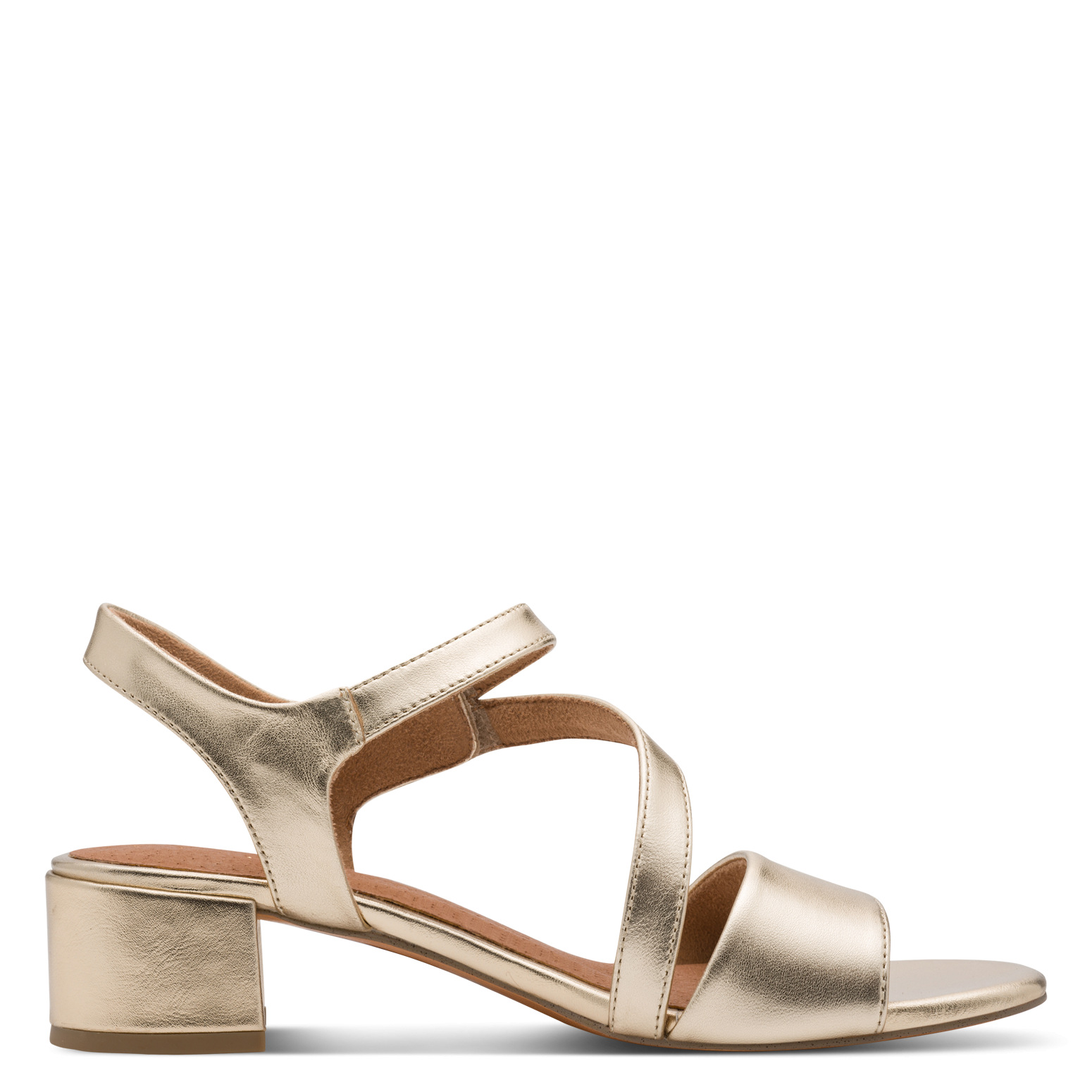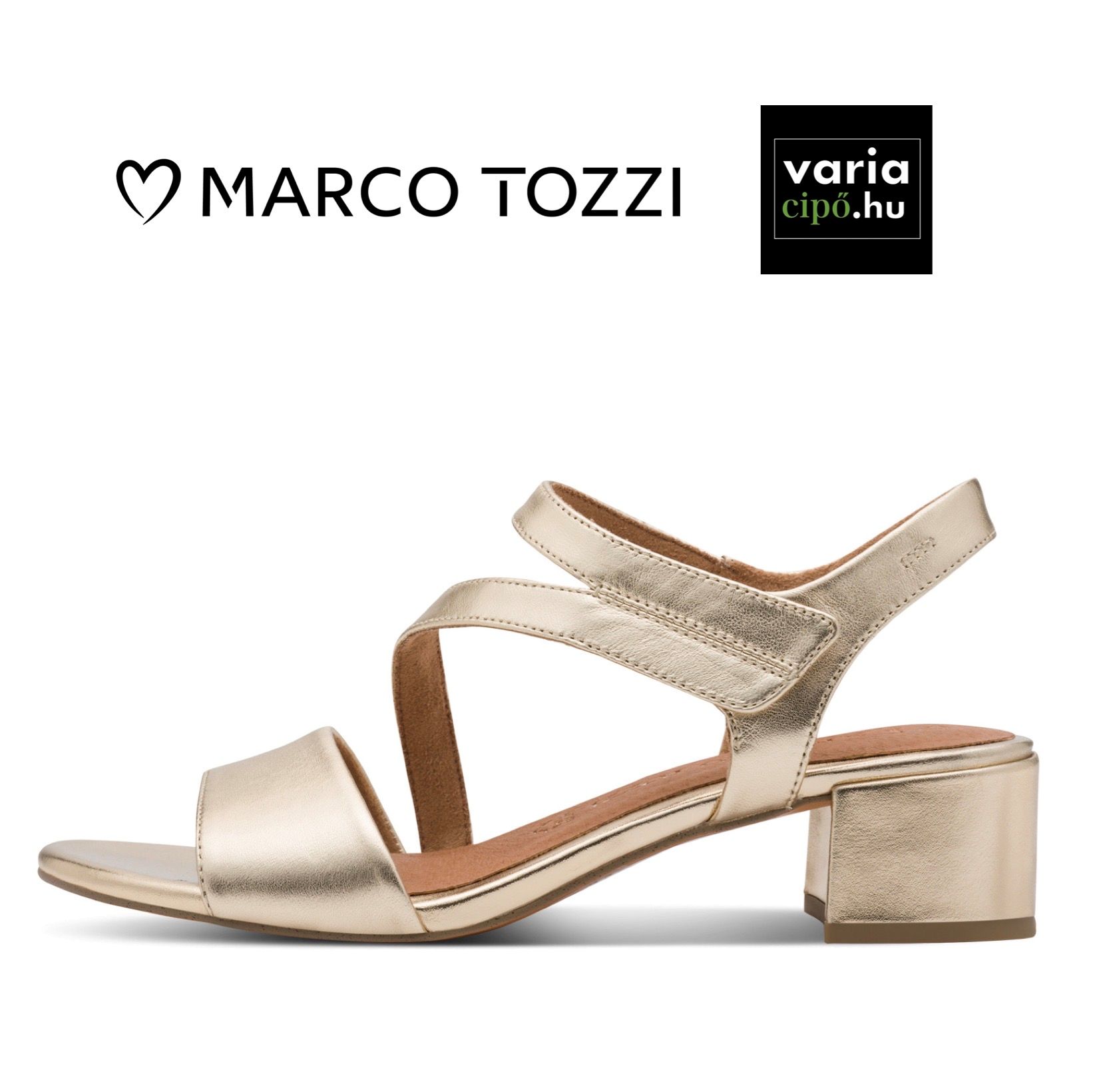 Elegáns arany színű, bőr női szandál tépőzáras pánttal és kényelmes magasságú block-sarokkal. A modell kényelmét “FEEL ME” memóriahabos talpbetét fokozza.