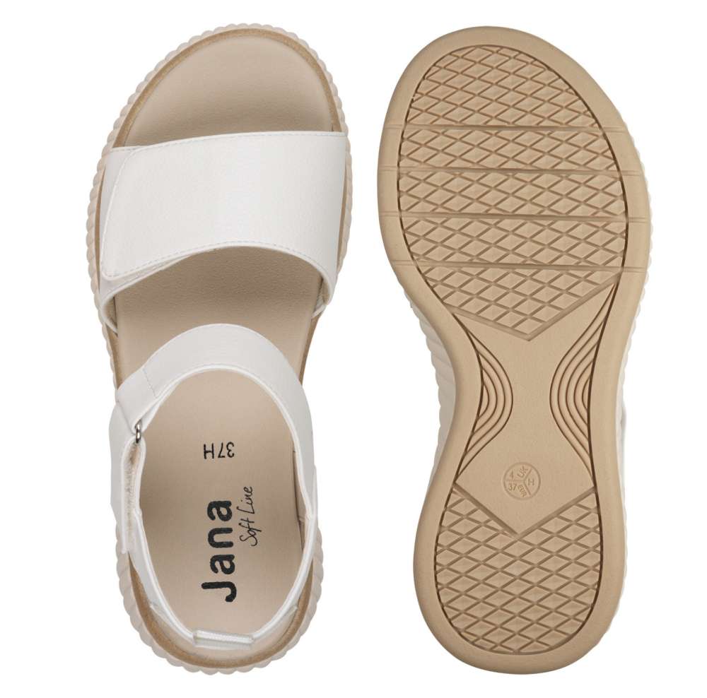 Vastag talpú Jana női szandál tépőzáras pántokkal, fehér felsőrésszel. Mindkét pántja állítható, ezért könnyen igazítható az átlagostól kissé eltérő lábfejhez is. Puha talpa és pántjai garantálják az egész napos kényelmet! A modell újrahasznosított anyagok felhasználásával készült, vegán cipő. “Jana Softline” kollekció.