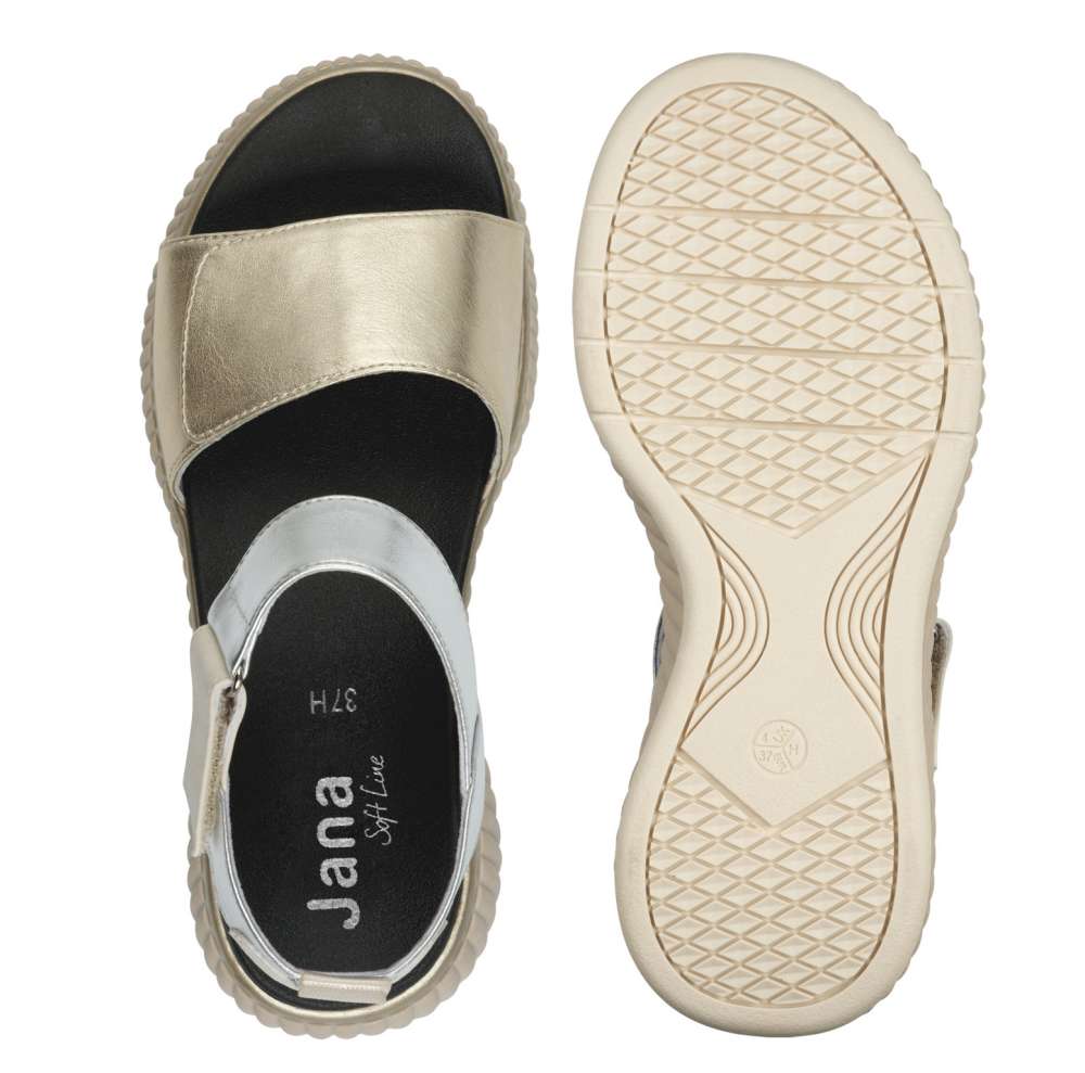 Vastag talpú Jana női szandál tépőzáras pántokkal, metál színű felsőrésszel, praktikus fekete talpbéléssel. Mindkét pántja állítható, ezért könnyen igazítható az átlagostól kissé eltérő lábfejhez is. Puha talpa és pántjai garantálják az egész napos kényelmet! A modell újrahasznosított anyagok felhasználásával készült, vegán cipő. “Jana Softline” kollekció.