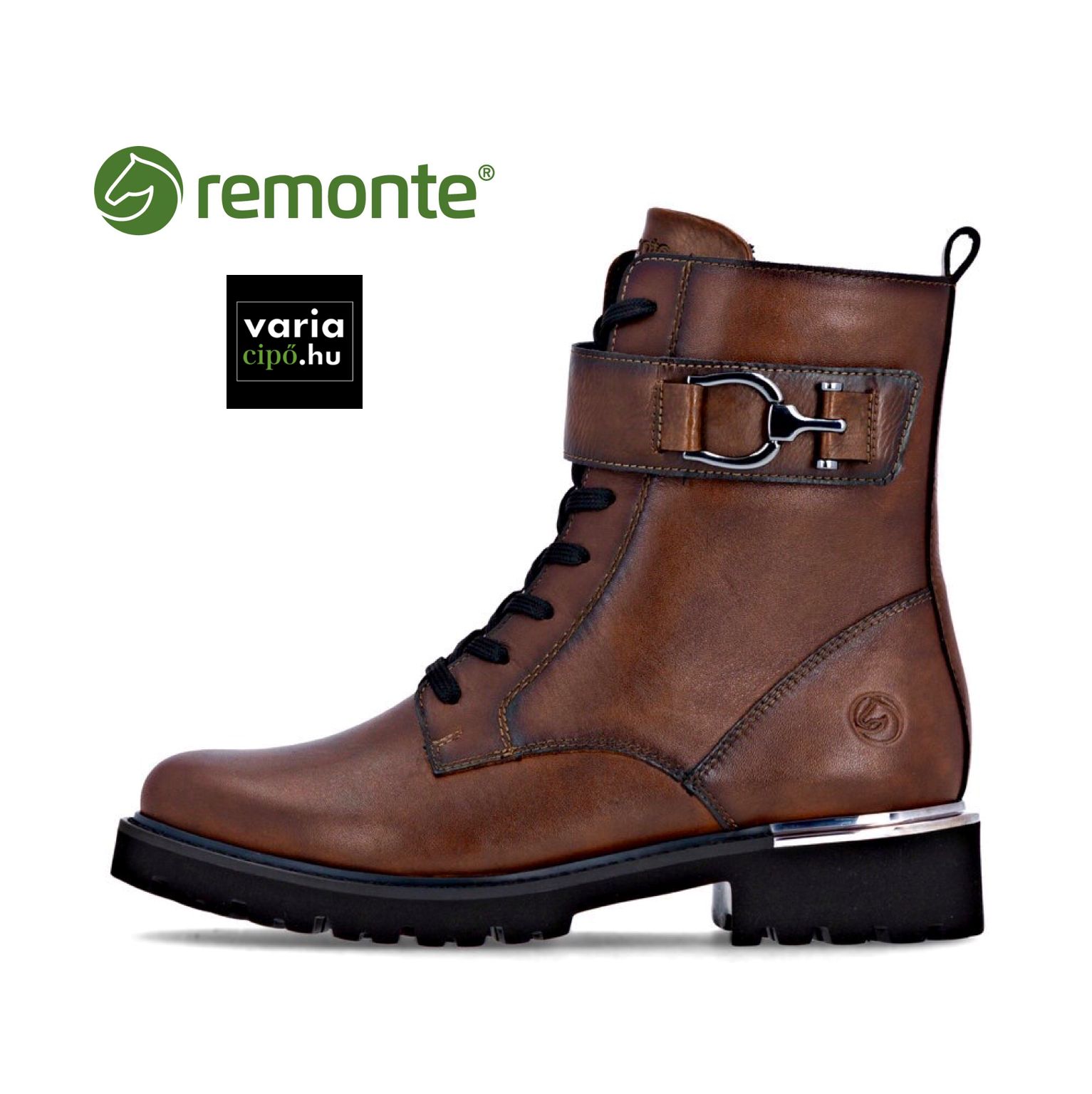 Remonte barna bőr bakancs alacsony sarokkal. Trendi, magas szárú bakancs középarna színben. Felső része csattal és márkalogóval díszített, sarkánál fém díszítés teszi különlegessé. Kivehető, memóriahabos talpbetétje egésznapos kényelmet biztosít a viselőjének. Sportos, fiatalos modell, amely nem nélkülözi a márkától megszokott magas fokú kényelmet és eleganciát.