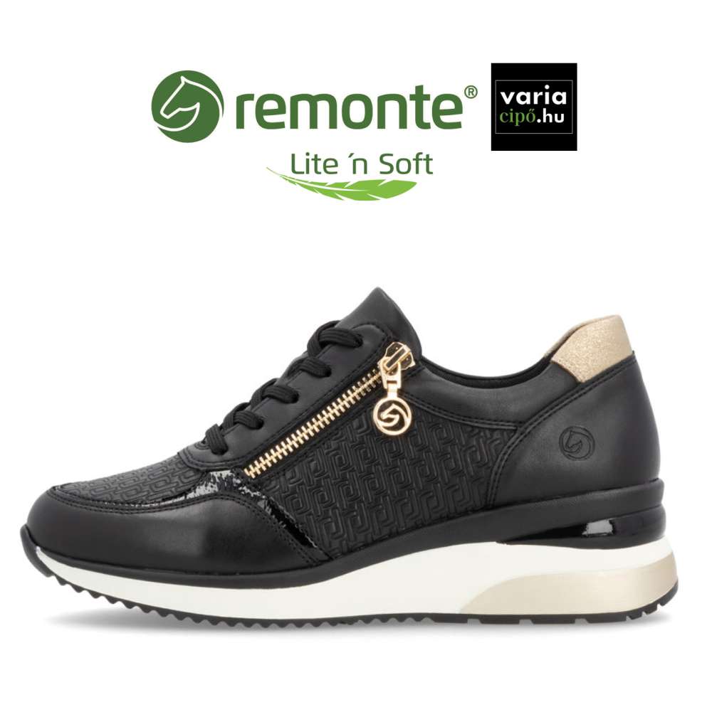 Remonte bőr sportcipő kombinált bőr felsőrésszel, elegáns fekete-arany színvilággal. A lábhoz való illeszkedését fűző és funkcionális cipzár biztosítja. Tökéletes kényelmi modell, melyet a kissé emelt sarkon kívül a belsejében található rugalmas-, gerincvédő-, légáteresztő-, cserélhető talpbetét ( Remonte Lite ’n Soft ) emel ki a sportos utcai cipő kategóriából.