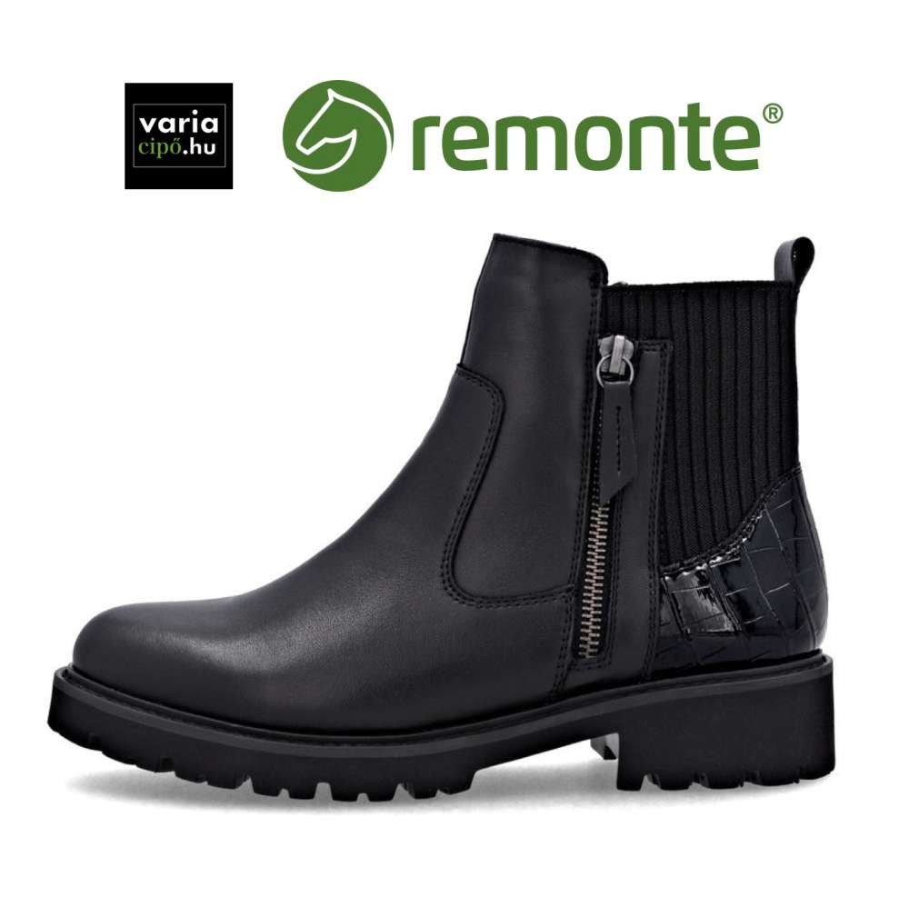 Fekete Remonte bőr bokacsizma alacsony sarokkal. Valódi bőrből, kombinált felsőrészét készült modell, hátsó részén rugalmas anyaggal – mely segíti a modell tökéletes illeszkedését -akár kissé szélesebb bokához is. Funkcionális cipzár gondoskodik a könnyű felhúzásról. Talpa vastag, a saroknál kissé emelt. Tökéletes kényelmi modell, melyet a belsejében található kivehető, memóriahabos talpbetét emel ki a kategóriájából.