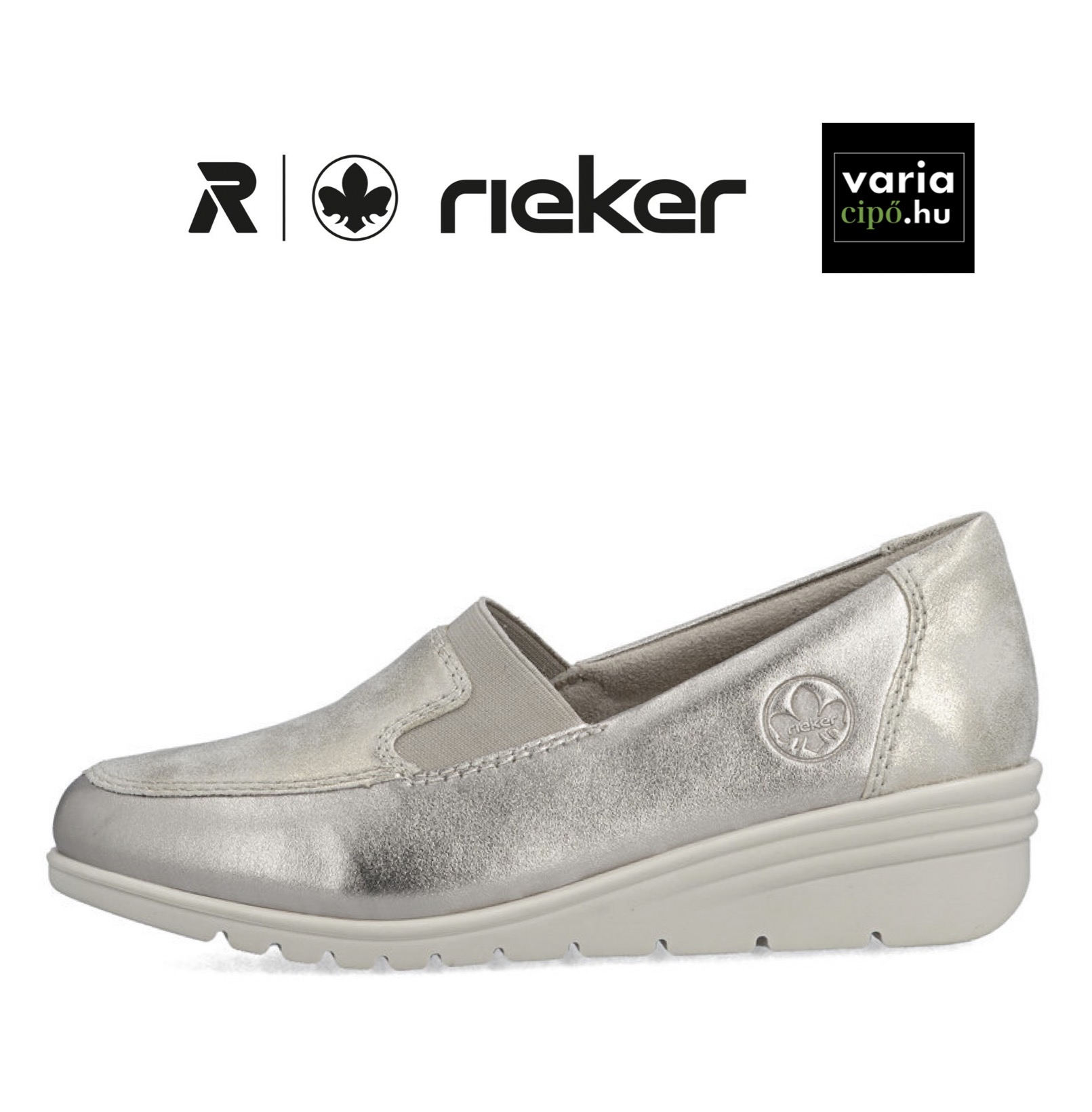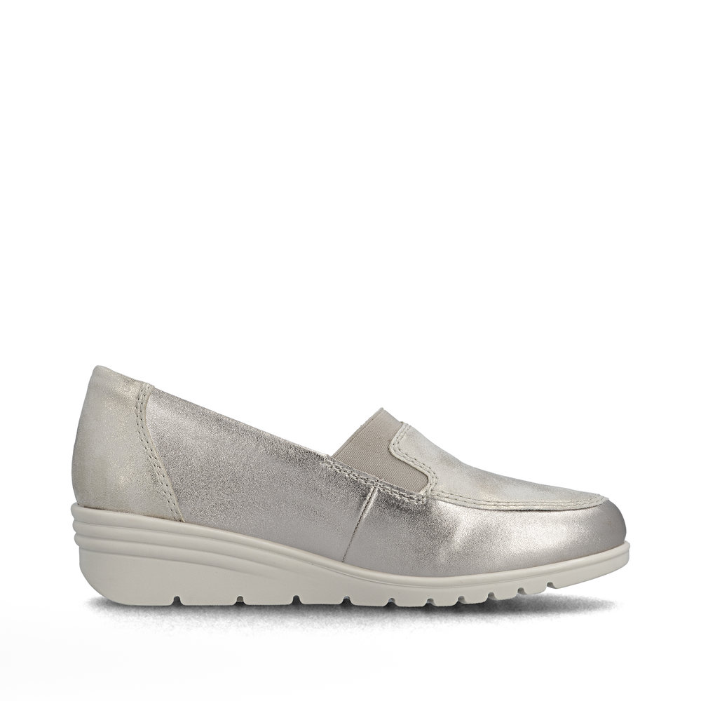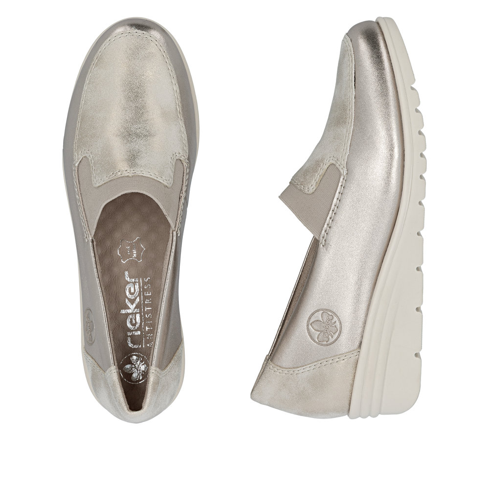 Rieker mokaszin emelt sarokkal, bézs-arany színű felsőrésszel készült klasszikus belebújós női cipő. A lábfejen található praktikus rugalmas szalag tökéletesen alkalmazkodik a láb formájához, és lehetővé teszi a könnyű és gyors felvételt. ANTISTRESS® technológiával készült kényelmi cipő, mely egész napos kényelmet biztosít a fáradt, érzékeny lábnak is.