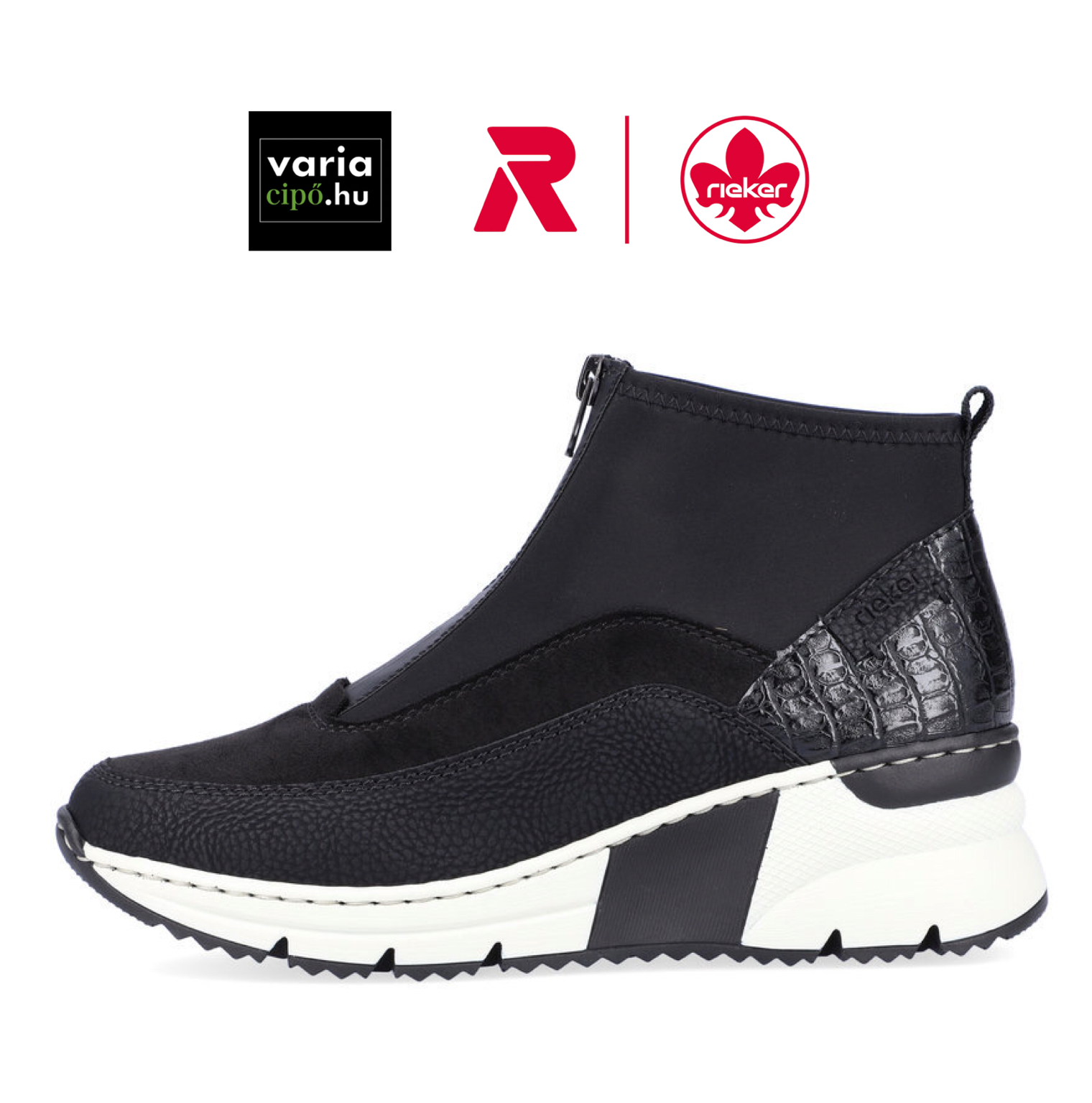 Rieker sportos bokacsizma kombinált fekete felsőrésszel és vastag, világos talppal. Sarka kissé emelt, a cipő felhúzását cipzár segíti. Kivehető talpbetéttel készült. Az “Antistress” technológia – négy stresszoldó tulajdonságának – könnyedség, rugalmasság, tágasság és kiváló ütéscsillapítás – köszönhetően a RIEKER cipő kényelmesebb járást kínál. Ez a modell ideális választás azoknak a nőknek, akik a sportos kényelem és a minőség kombinációját keresik.