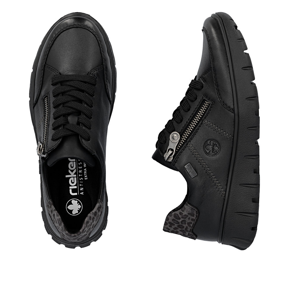 Rieker tex fekete félcipő. Trendi és kényelmes női sneaker kombinált bőr felsőrésszel, állatmintás díszítéssel. A cipő lábhoz való illeszkedését fűző és cipzár biztosítja. Belsejében kivehető, RiekerSoft – egyedi talpbetét található, amely puhítja a lépést és alkalmazkodik a láb formájához. ANTISTRESS® technológiával készült kényelmi cipő, melyet hosszú távú viseletre, kényes lábra, fáradékony láb esetén egyaránt jó szívvel ajánlunk! Extra széles modell.