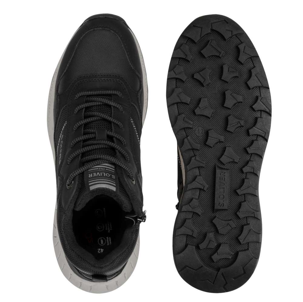 S.Oliver Tex fekete bakancs kombinált szintetikus-textil felsőrésszel, kontrasztos világos talpon. Textil (nem bundás) béléssel, belső részén cipzárral készült. Kényelmét “SOFT FOAM” memóriahabos talpbetét fokozza.