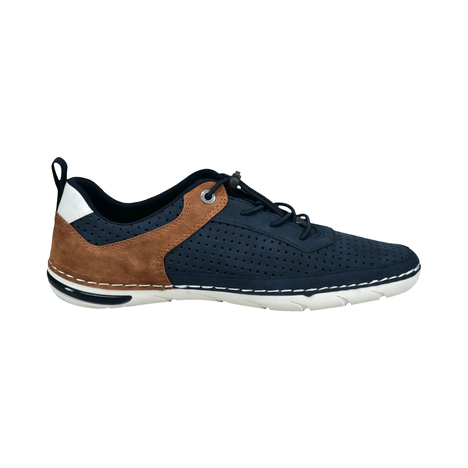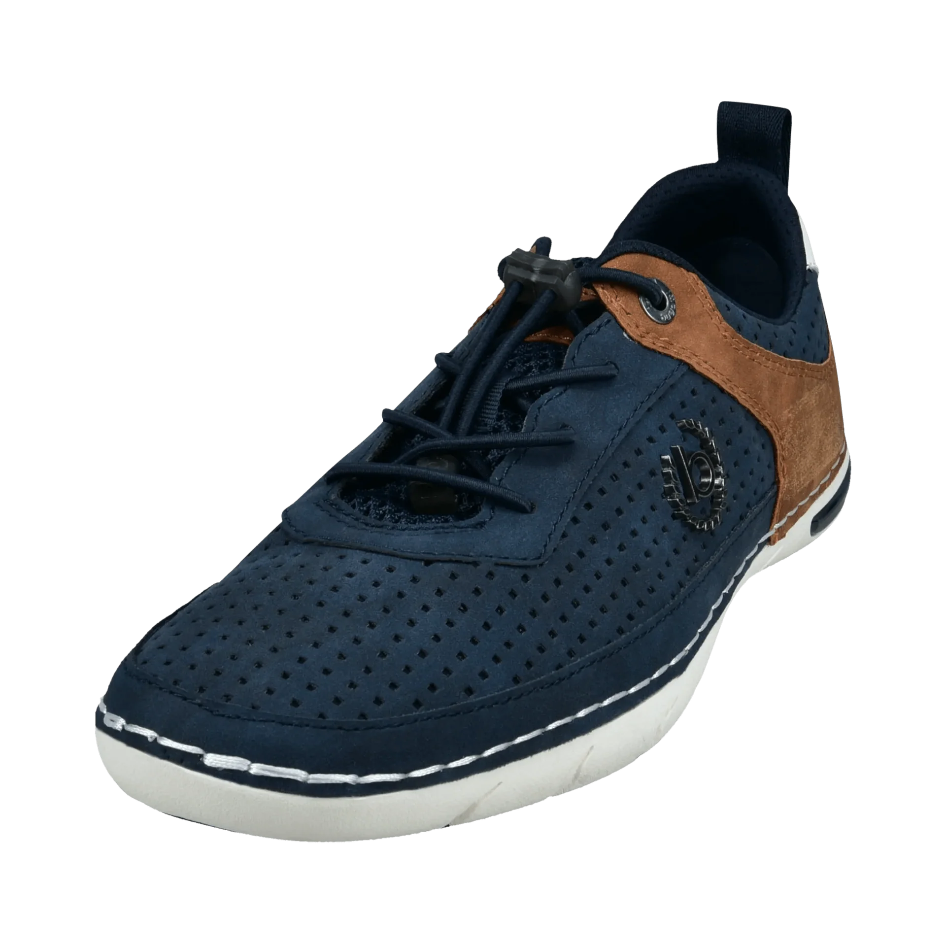 Sötétkék Bugatti nyári cipő perforált mintázatú felsőrésszel. Rugalmas talpszerkezettel és kivehető talpbetéttel ellátott modell. A lábhoz való tökéletes illeszkedését rugalmas fűző biztosítja. Modern, városi stílus, optimális szellőzéssel.