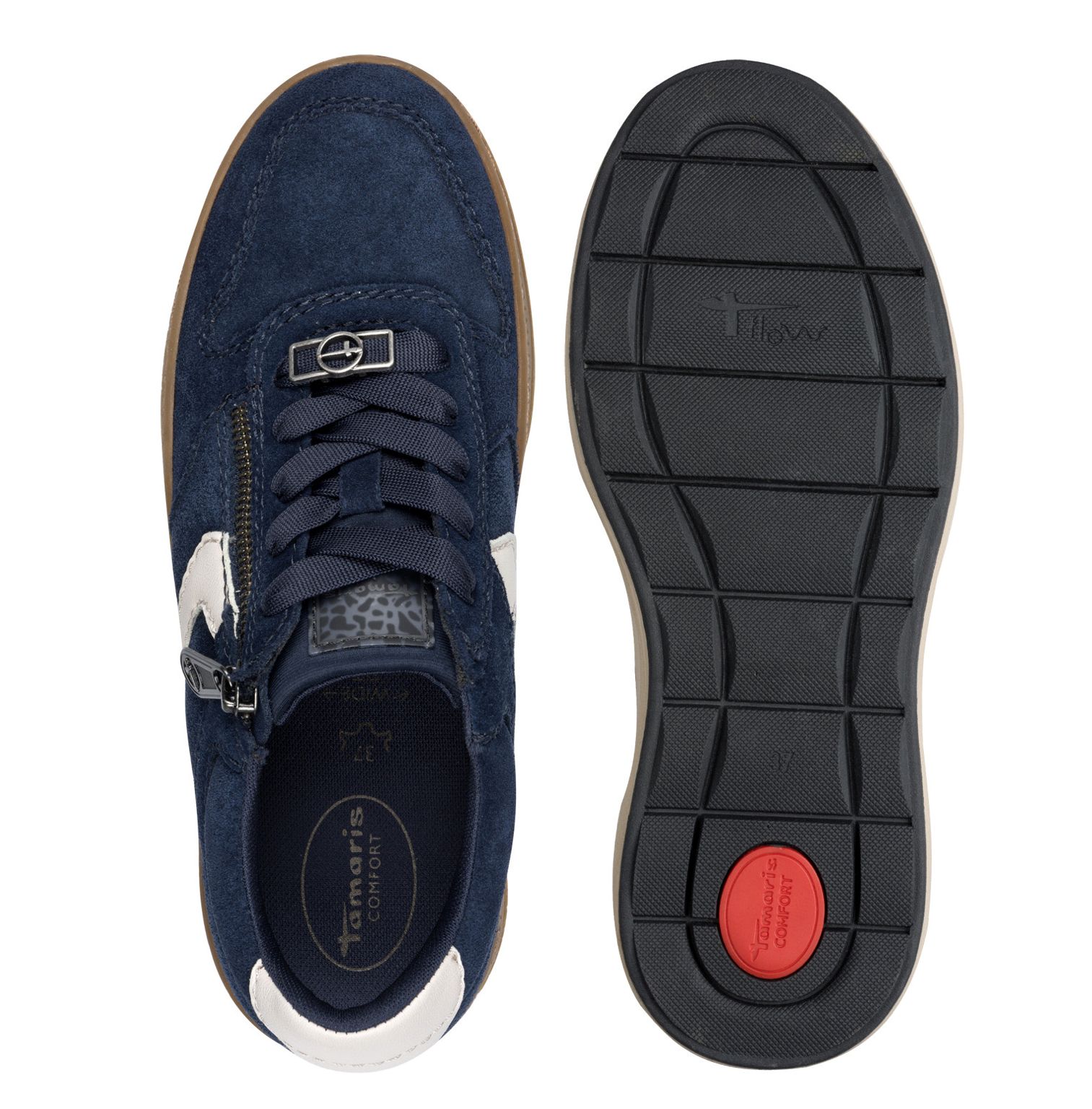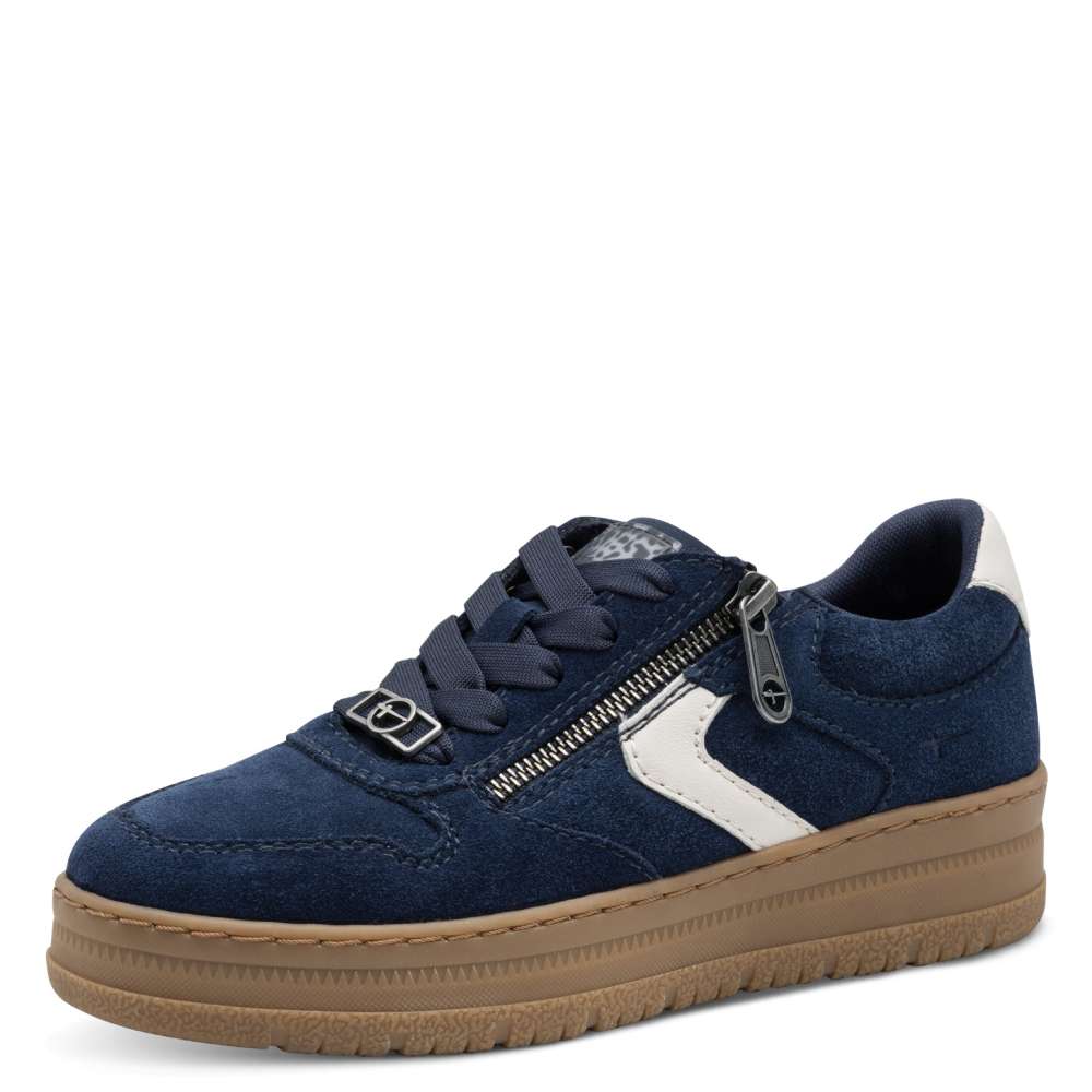 Tamaris Comfort sötétkék sportcipő, kombinált bőr felsőrésszel. Trendi, sportos modell vastag, barna talpon. Felhúzását és lábhoz történő igazítását fűző segíti. Belsejében puha, kivehető talpbetét gondoskodik a hosszú távú kényelemről. Wide FIT kényelmi szélességű modell, rugalmas talpon.