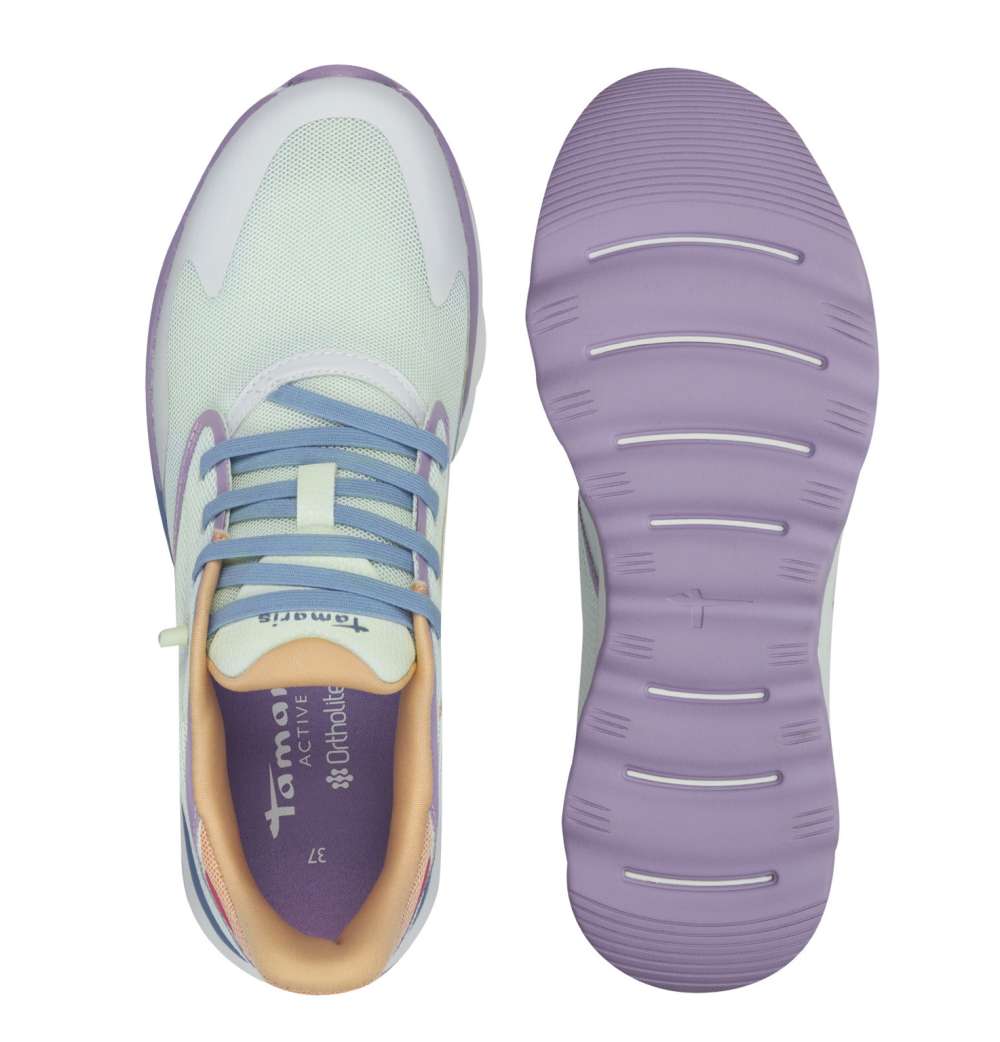Tamaris menta sportcipő – mentazöld, multicolor díszítéssel. Rendkívül könnyű, jól szellőző felsőrésszel készült sneaker. Rugalmas anyagokból, kivehető “ORTHOLIGHT” talpbetéttel készült, melyek biztosítják a hosszú távú kényelmet – akár a meleg nyári napokon is. Fiatalos, sportos modell.